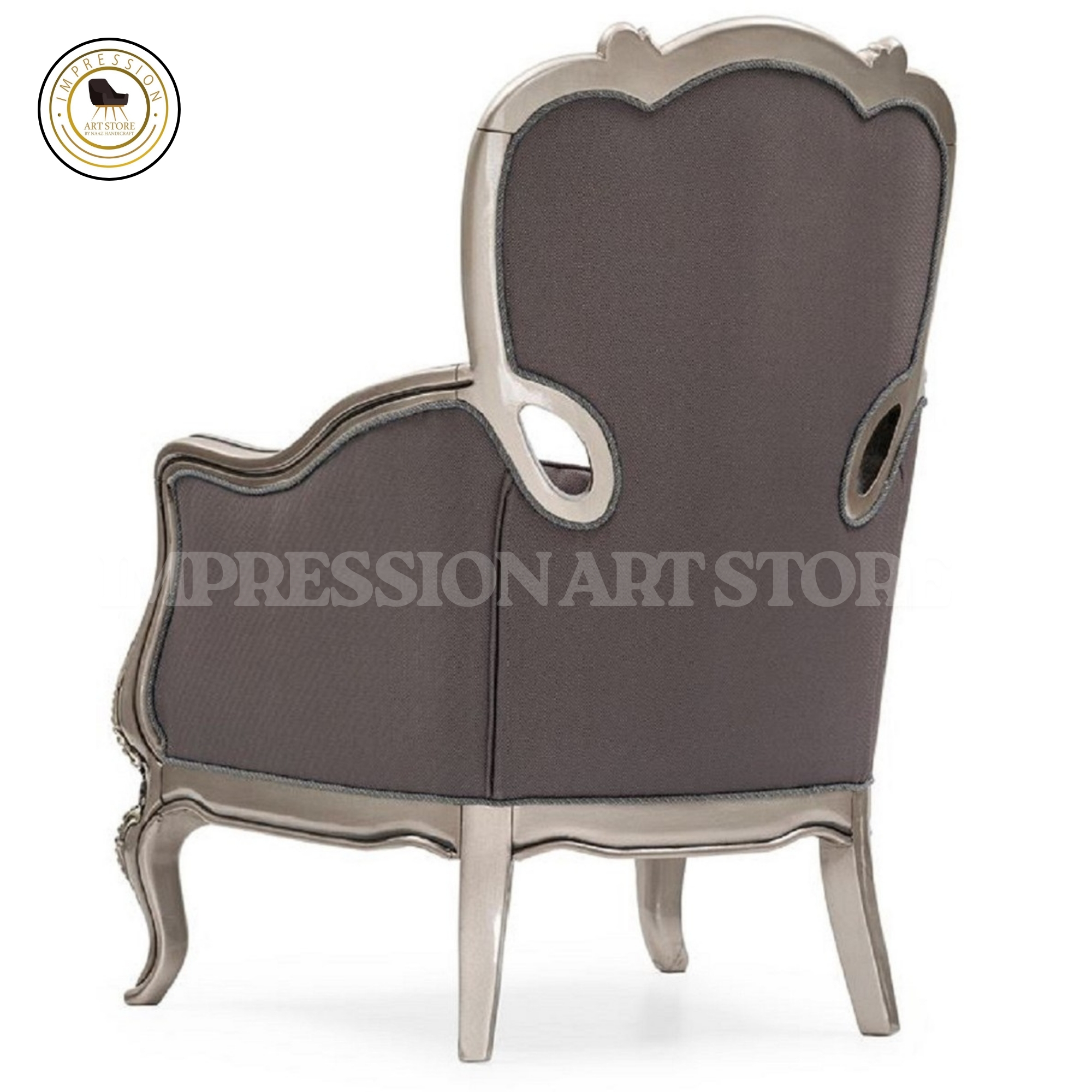 The entire exposed wood frame is finished in a luminous Antique Silver or Aged Platinum Deco Paint. This specialized application technique settles beautifully into the carved details, providing a dimensional, cool-toned elegance that is both modern and timeless. This refined metallic finish distinguishes the set, moving beyond traditional gold and creating a unique high-end statement.