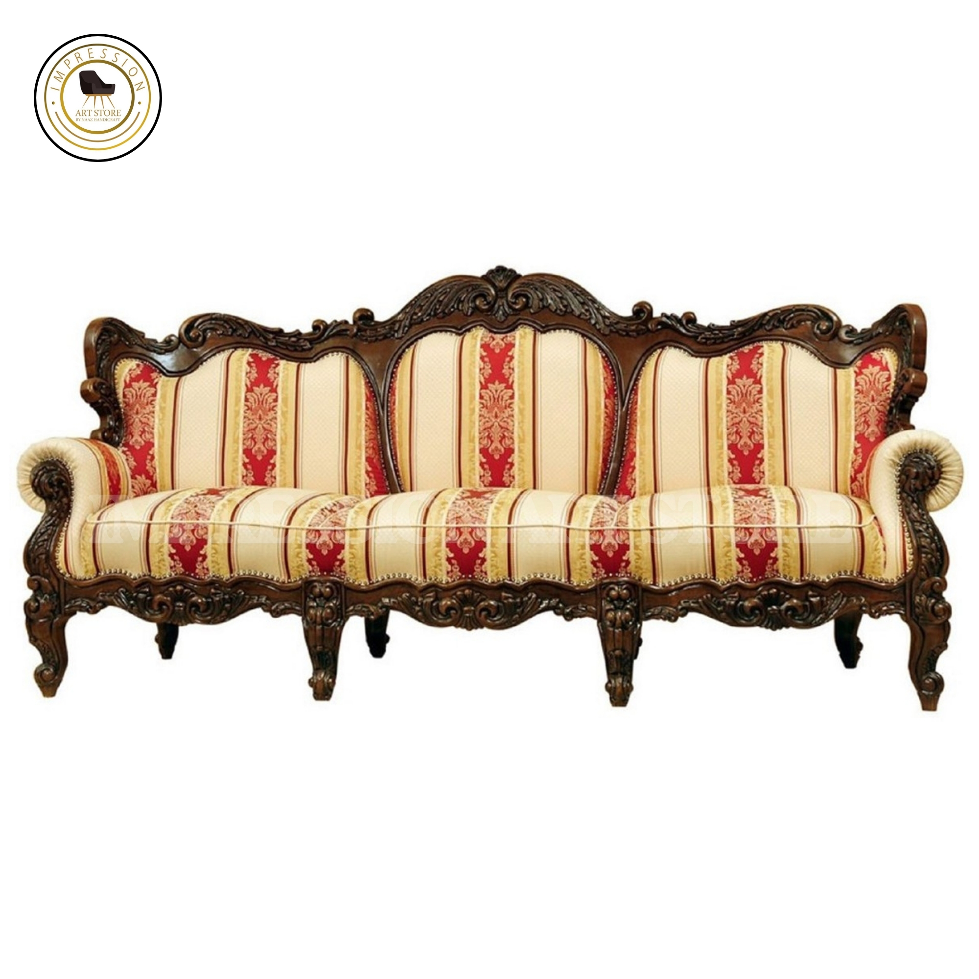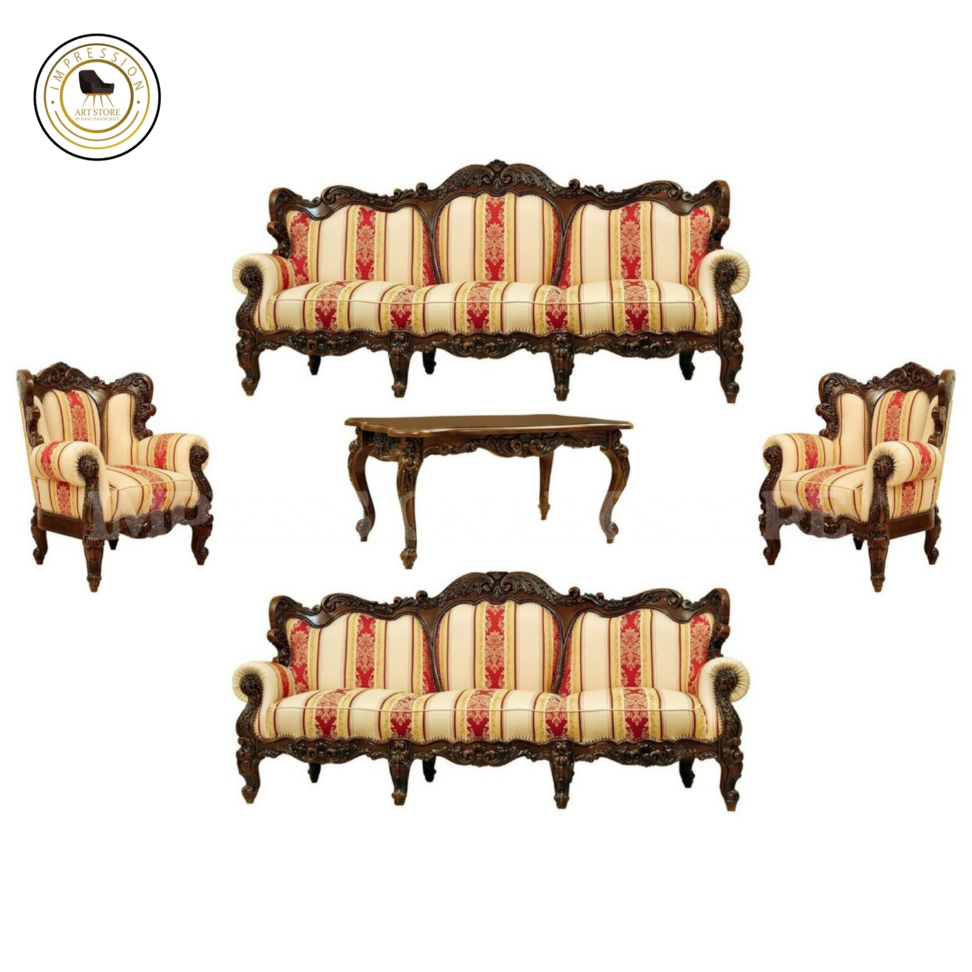 The set includes two large 3-Seater Sofas and two accompanying Single Armchairs, ensuring a cohesive and expansive seating arrangement. The upholstery is a truly defining feature, utilizing a premium, durable fabric with bold stripes and elaborate patterns (Cream base with rich Red/Gold accents). This fabric choice instantly evokes a sense of Victorian or grand European classic interior design, creating visual richness and texture. The thick, high-density cushions ensure the seating is as comfortable as it is magnificent.