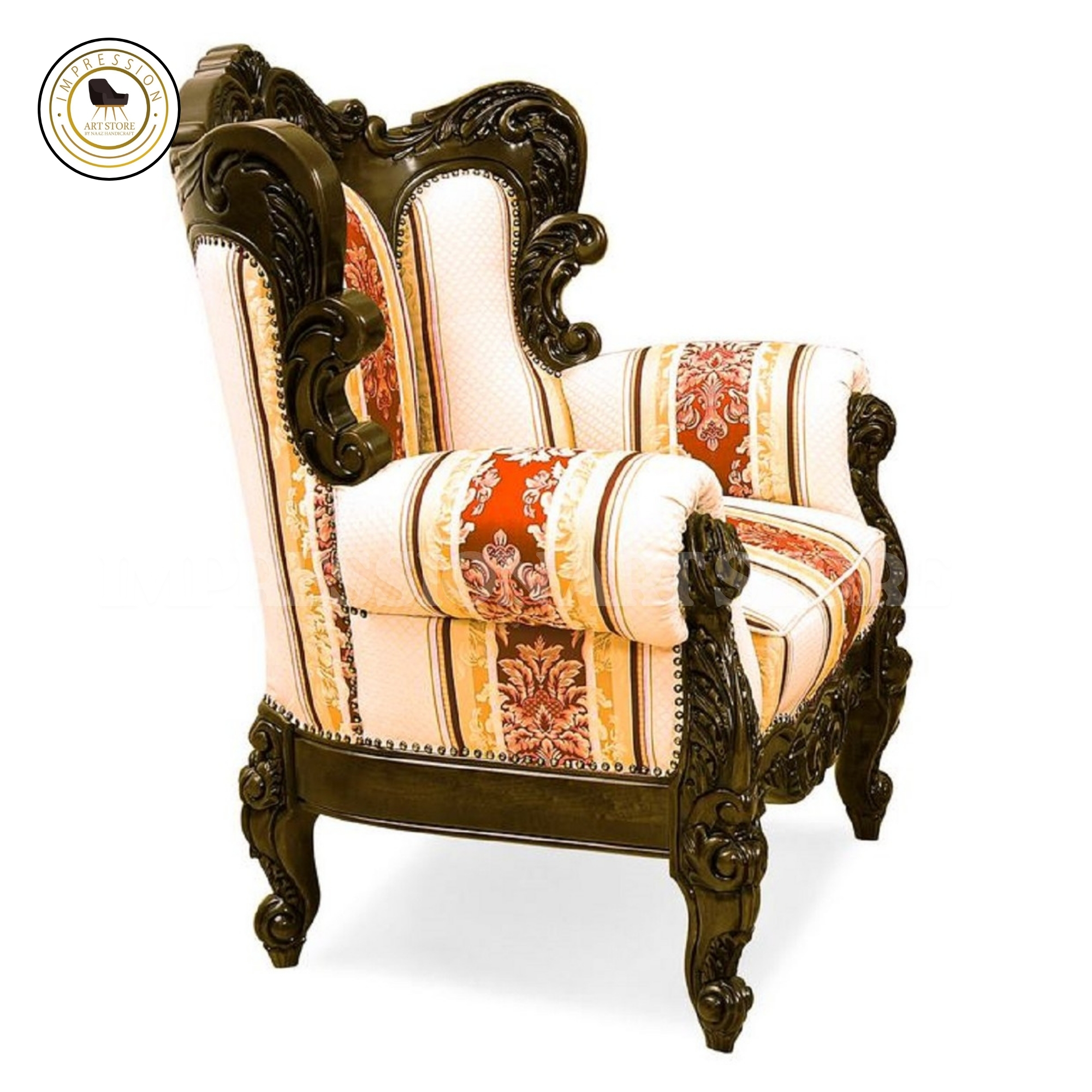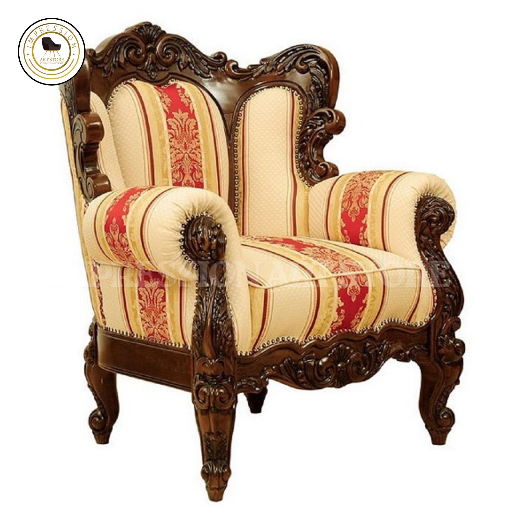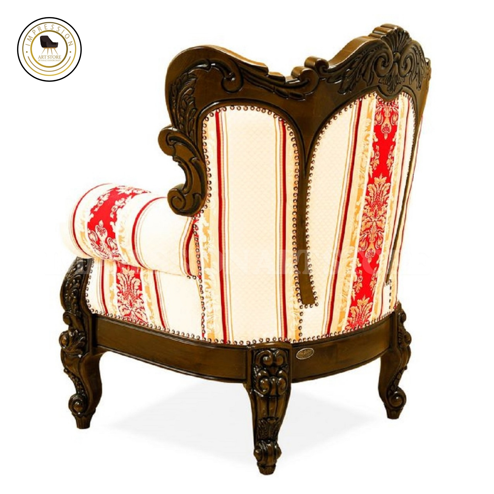 Striking Patterned Upholstery: Clad in premium Striped and Patterned Fabric (Cream/Red/Gold tones), offering a rich, dimensional texture and a truly classic aesthetic that makes a grand statement.