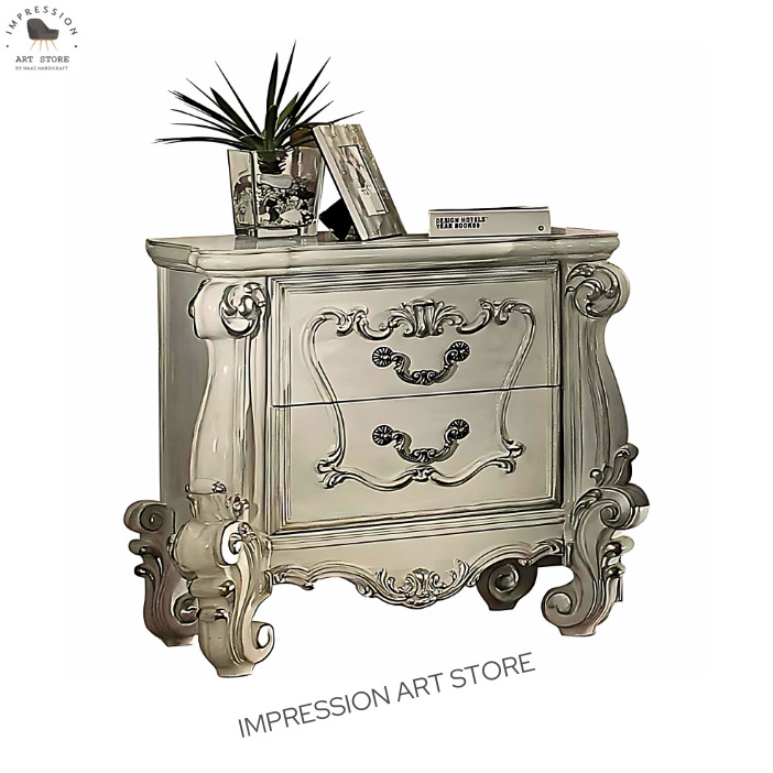 - Intricate Wood Carvings: Handcrafted ornate detailing on the bed frame, dresser, and nightstand.