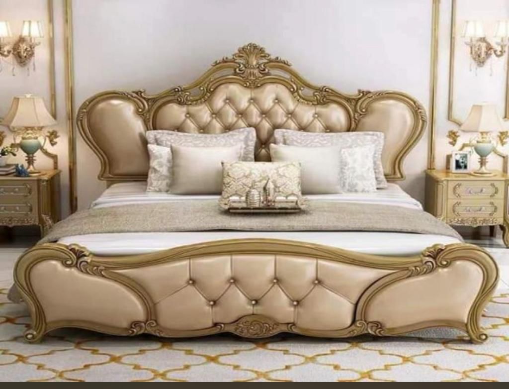 The structural frame of this bed and the accompanying nightstands are built from robust Solid Teak Wood (or equivalent hardwood), providing the perfect stable foundation for the elaborate ornamentation. Our specialized Saharanpur artisans apply their expertise to the deep Baroque-style carving that adorns every segment—from the ornate headboard crest to the nightstand mouldings.