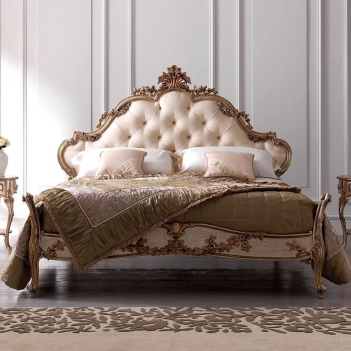 The centerpiece, the King Size Bed, features a tall, scrolled headboard with wide, plush Cream or Ivory Tufted Panels. This meticulous tufting adds dimension, retains cushion shape, and signals the supreme comfort and tailored quality that accompanies this majestic design. The low, curved footboard offers potential for internal box storage (if applicable), maximizing functionality without sacrificing the opulent aesthetic.